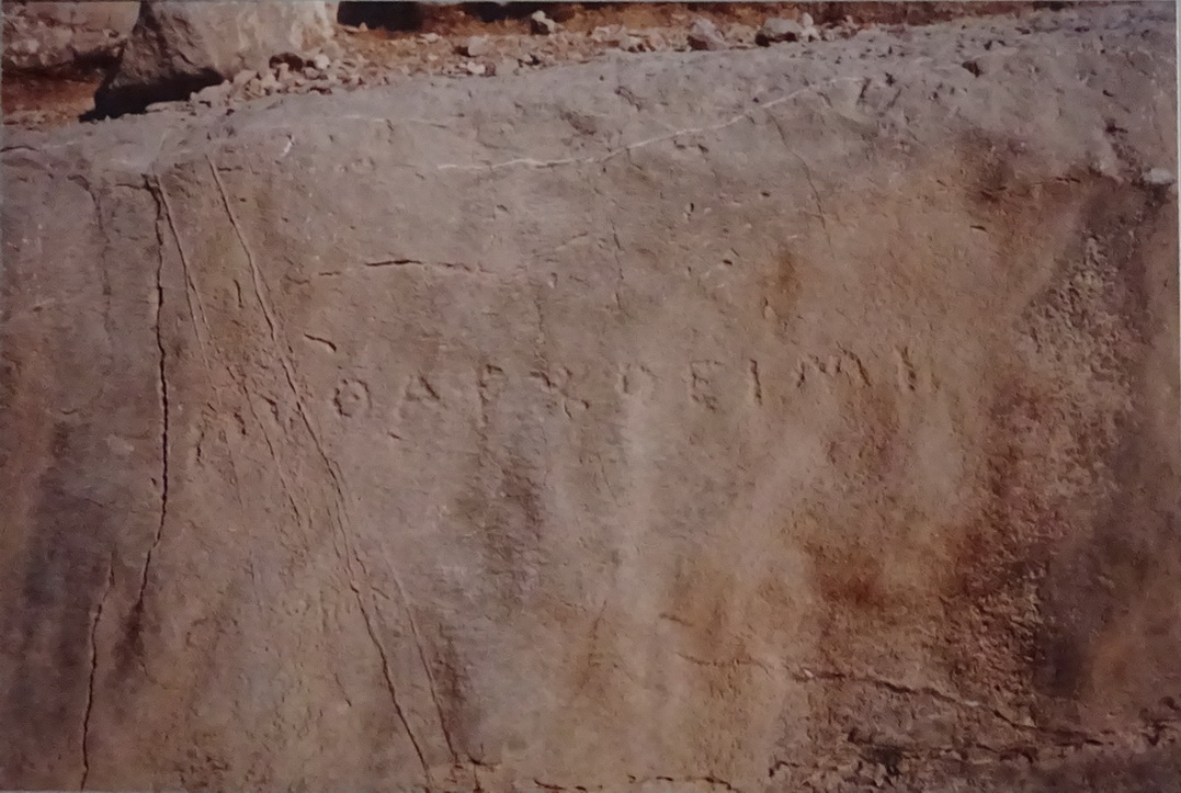 Greek graffiti. Kūh-e Raḥmat limestone quarry. Barzan-e Šomāli (‘Northern District’), Pārseh (Persepolis), Fārs province, Iran. Ca. 500 BC? Discovered by the Mission of the Istituto Italiano per il Medio ed Estremo Oriente. Letter dimensions not recorded.
